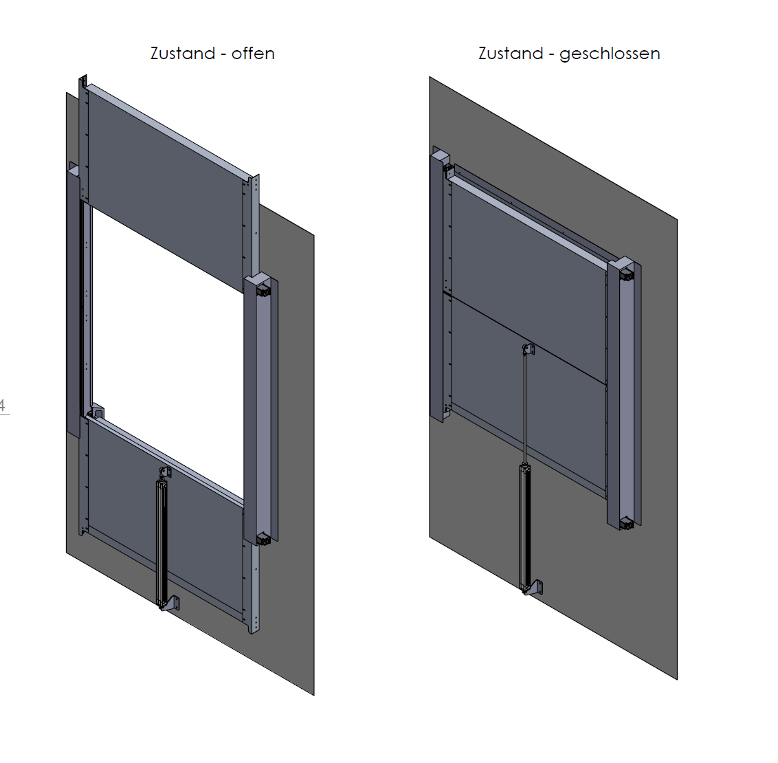 Mayrtec Engineering entwickelte und konstruierte eine automatische Beladetür für ein Bearbeitungszentrum mit Roboterbeladung. Durch die Koppelung der zwei einzelnen Schiebelemente konnte es über einen Pneumatikzylinder realisiert werden. Zudem schwenkt beim Schließen der Elemente automatisch über Kurvenrollen im inneren der Maschine ein Abstreifblech ein. Hierzu wird verhindert das Kühlmittelflüssigkeit über die nachträglich von außen eingebaute Beladetür austreten kann.